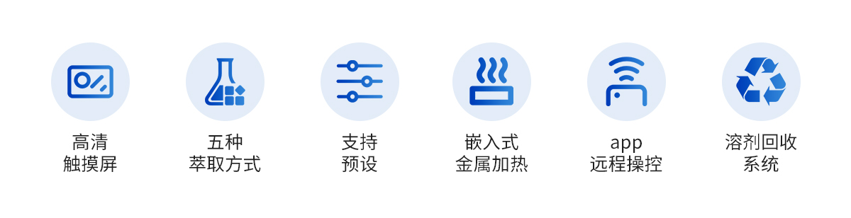 | ?全部有機溶劑均可使用,包括苯類、微類、酮類 等,滿足各種有機溶劑的使用條件 | ?采用全自動標(biāo)準(zhǔn)索氏萃取,全通道為玻璃與四氟材質(zhì),有效避免雜質(zhì)的引入,準(zhǔn)確性高 | ?可以app遠(yuǎn)程操作控制,實現(xiàn)遠(yuǎn)程通訊功能,方便客戶實時查看實驗允許情況 | ?采用一鍵開始與暫停操作,實驗過程掌控靈活 | ?外置壁掛型控制器,方便靈活,簡單快捷 | ?采用七寸大液晶觸摸屏控制,顯示屏具有折疊功能,不用時可以收起不占用空間 | ?五種萃取方式,滿足不同客戶萃取需求 | ?預(yù)設(shè)常用試劑選項,高頻次實驗一鍵輕松搞定 | ?整體嵌入式金屬加熱,升溫更快,效率更高 | ?進(jìn)出水路溫度監(jiān)控與流量控制,配合冷凝水有無實時監(jiān)測,保證有機蒸氣冷凝回流無泄漏的效果下,節(jié)約水資源 | ?具有高-效的溶劑回收系統(tǒng),有效減少試劑的浪費 |