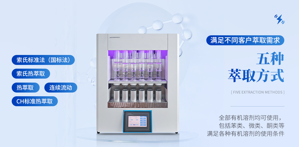 全自動脂肪測定儀(索氏提取儀)是根據(jù)索氏抽提原理,對脂肪等有機物進(jìn)行萃取分離的儀器。儀器具有索氏標(biāo)準(zhǔn)法(國標(biāo)法)、索氏熱萃取、熱萃取、連續(xù)流動及CH標(biāo)準(zhǔn)熱萃取等五種萃取方式;采用整體嵌入式金屬加熱,升溫快, 效果好,功耗低。安卓風(fēng)格界面設(shè)計,豎屏外置壁掛式控制器,使操作更加簡便快捷;進(jìn)出水路全方位溫度監(jiān)控與流量控 制,更加環(huán)保與節(jié)約;內(nèi)置乙謎泄漏檢測 裝置有效防止空氣污染,充分保障了實驗的安全性。