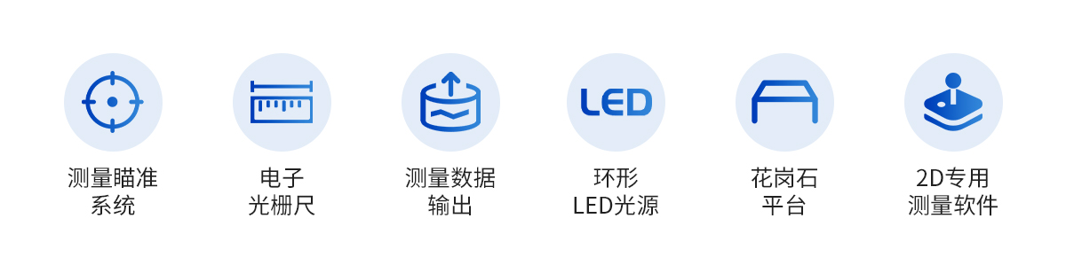 | 儀器基座 | CCD | 鏡頭 | 光柵尺 | 導(dǎo)軌 | 傳動(dòng) | 表面光源 | 底光源 | 數(shù)據(jù)采集卡 | 影像測(cè)量軟件 | 光學(xué)校正片 | 電纜 |