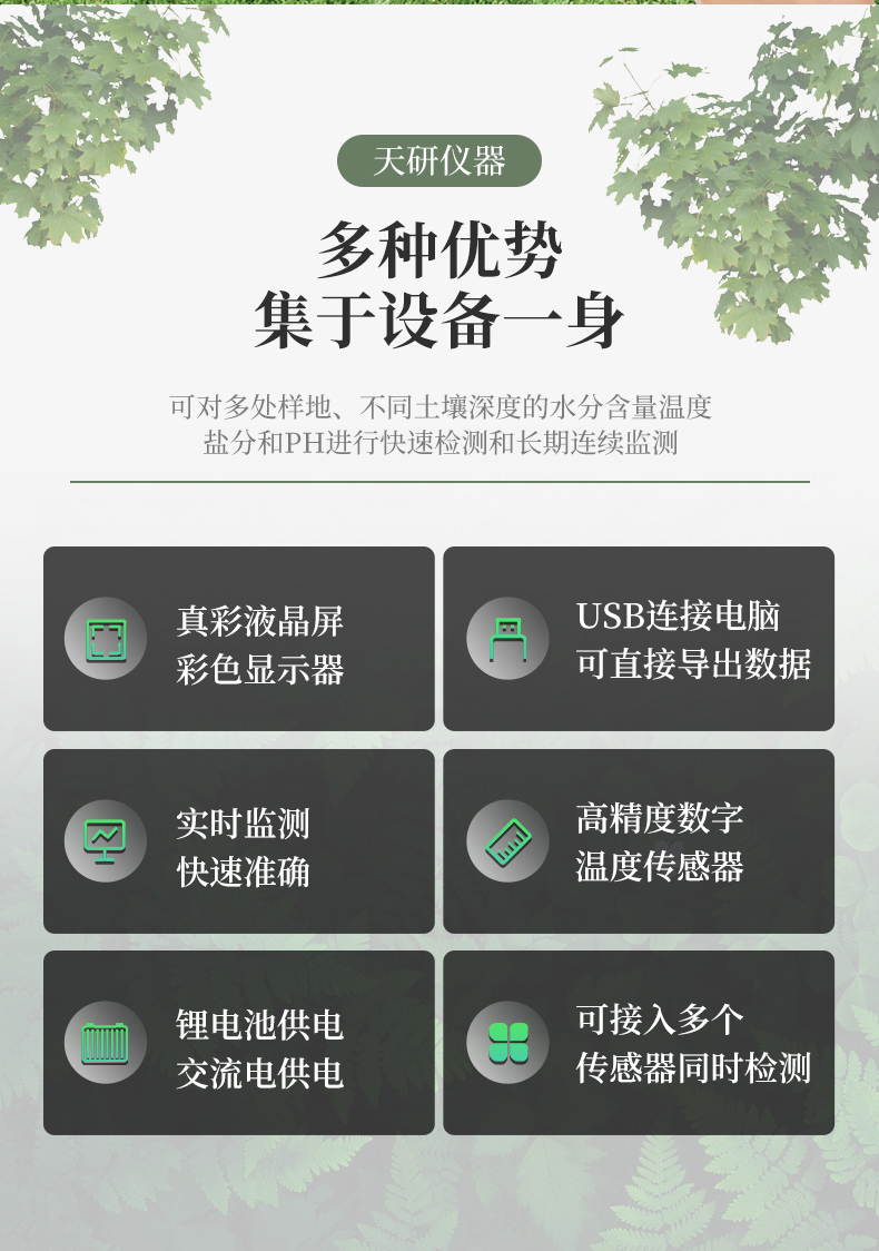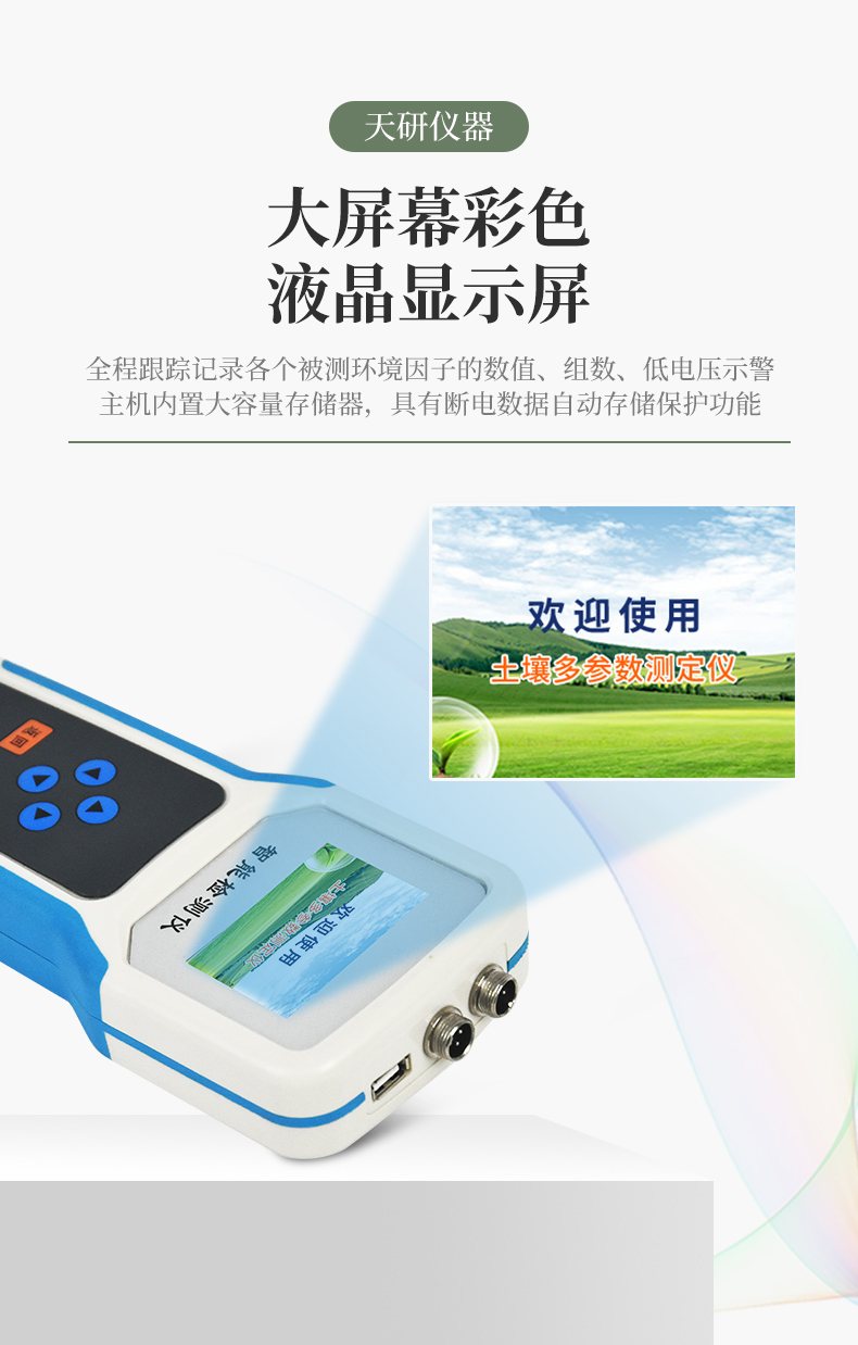 | 儀器可加配4G聯(lián)網(wǎng)功和能數(shù)據(jù)管理平臺,將本機(jī)存儲的被測點環(huán)境因子測量歷史數(shù)據(jù)無線上傳到智慧云農(nóng)業(yè)平臺,方便用戶進(jìn)行數(shù)據(jù)管理和長期分析。 | 本機(jī)體積小巧、美觀,操作簡單方便,性能可靠,野外攜帶極為方便。主機(jī)連接傳感器后可以手動存儲記錄也可通過主機(jī)任意設(shè)置采樣間隔,自動存儲記錄數(shù)據(jù)。 | 大屏幕彩色液晶顯示屏,全程跟蹤記錄各個被測環(huán)境因子的數(shù)值、組數(shù)、低電壓示警,主機(jī)內(nèi)置大容量存儲器,可儲存三十萬條數(shù)據(jù),具有斷電數(shù)據(jù)自動存儲保護(hù)功能。 | 各個傳感器插入主機(jī)后,主機(jī)具有自動識別功能,傳感器一致性好,可按需求自行組合傳感器,不同參數(shù)的傳感器接口可以互相轉(zhuǎn)換,對測量精度沒有影響。 | 儀器具有多通道自動檢測擴(kuò)展功能,可以實現(xiàn)多個傳感器同時接入的同步檢測。 | 上位機(jī)軟件功能強大,隨時可以通過USB接口將記錄中的數(shù)據(jù)導(dǎo)出到計算機(jī)上,并可以存儲為EXCE表格文件,生成數(shù)據(jù)曲線,以供其它分析軟件進(jìn)一步進(jìn)行數(shù)據(jù)處理。具有設(shè)置超限區(qū)域著色功能,超限數(shù)據(jù)變色預(yù)警,可作為環(huán)境評價的一個依據(jù)。 |