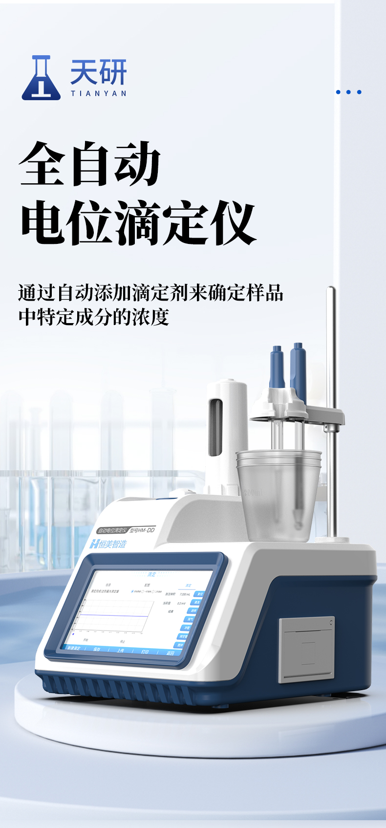 自動(dòng)電位滴定儀是一種用于化學(xué)分析的精密儀器,通過(guò)自動(dòng)添加滴定劑來(lái)確定樣品中特定成分的濃度。該儀器基于電位滴定原理工作,即根據(jù)在滴定過(guò)程中電池電動(dòng)勢(shì)的變化來(lái)確定滴定終點(diǎn)的一款滴定設(shè)備。設(shè)備滿(mǎn)足國(guó)家檢定規(guī)程JJG 814-2015《自動(dòng)電位滴定儀》儀器級(jí)別中的0.05級(jí)別,即儀器最大示值誤差為±1.5%,儀器示值重復(fù)性≤0.2%。