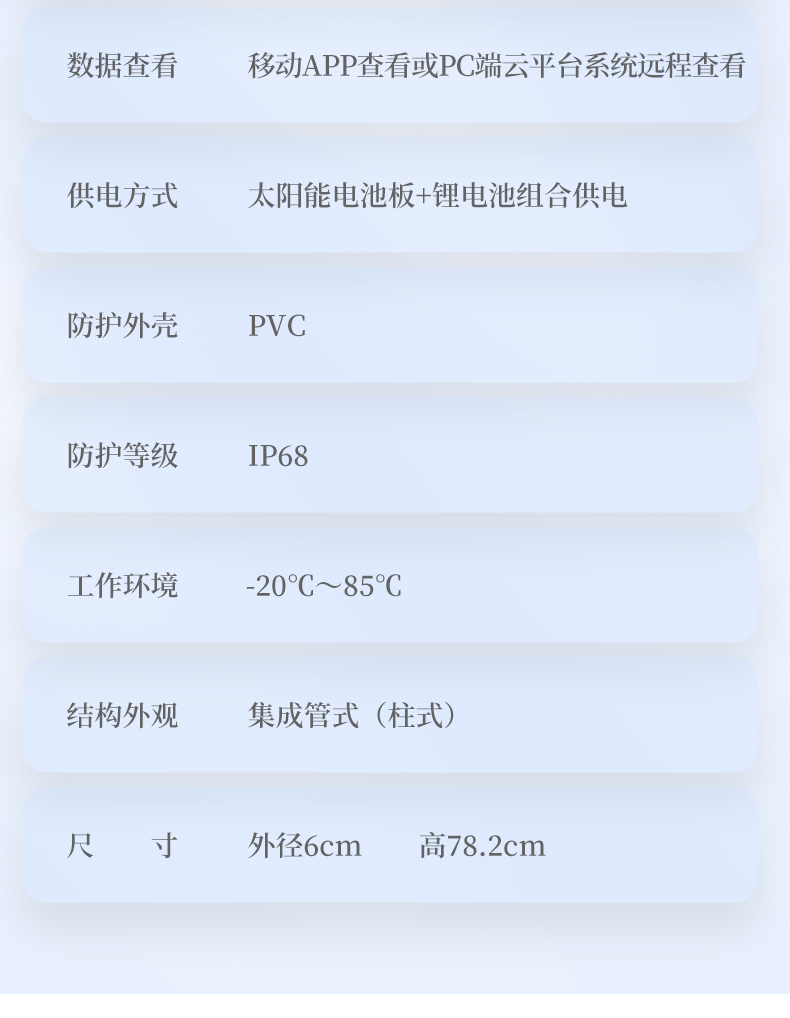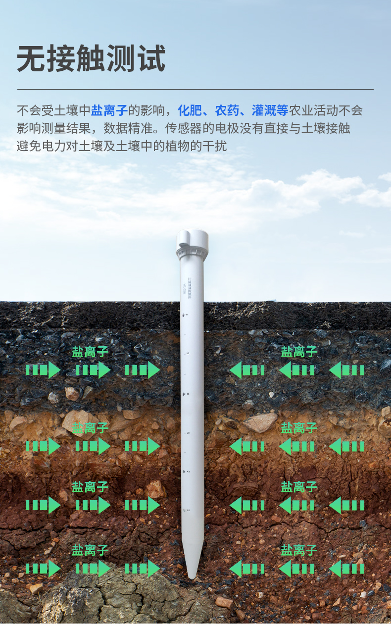 | 1、外殼采用PVC塑料管,內(nèi)部發(fā)射近1G赫茲的高頻探測波,可以穿透塑料管,有效感知土壤環(huán)境。 | 2、不受土壤中鹽離子的影響,化肥、農(nóng)藥、灌溉等農(nóng)業(yè)活動不會影響測量結(jié)果,數(shù)據(jù)精準。 | 3、傳感器的電極沒有直接與土壤接觸,避免電力對土壤及土壤中的植物的干擾。 | 4、產(chǎn)品采用標準的Modbus-RTU485通信模式,最遠通信2000米。 | 5、支持10-30V寬電壓充電。 | 6、一體式可同時監(jiān)測四層土壤溫濕度。 |