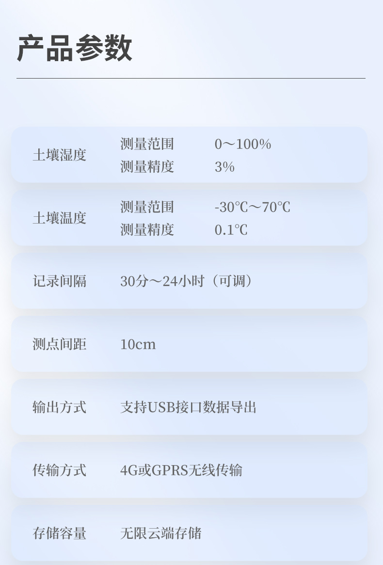 | 1、工作溫度:-40℃-80℃ | 2、土壤濕度:0~100%(±5%) | 3、土壤溫度:-15℃~35℃(±0.5℃) | 4、測點間距:10cm | 5、供電方式:10-30V寬直流供電 | 6、外殼:PVC塑料管 | 7、防護等級:地面以下部分IP68 | 8、輸出信號:RS485(Modbus協(xié)議) | 9、功耗:四層 0.9W |