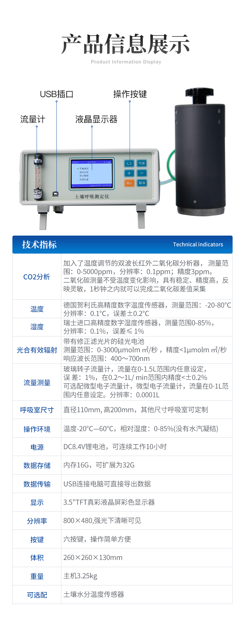 | 1、 CO2分析:加入了溫度調(diào)節(jié)的雙波長紅外二氧化碳分析器, 測量范圍:0-5000ppm,分辨率:0.1ppm; 精度3ppm。二氧化碳測量不受溫度變化影響,具有穩(wěn)定、精度高,反映靈敏,1秒鐘之內(nèi)就可以完成二氧化碳差值采集。 | 2、溫度:德國賀利氏高精度數(shù)字溫度傳感器,測量范圍:-20-80℃,分辨率:0.1℃,誤差±0.2℃ | 3、 濕度: 瑞士進口高精度數(shù)字濕度傳感器,測量范圍0-85%,分辨率:0.1%,誤差≤ 1% | 4、光合有效輻射:帶有修正濾光片的硅光電池,測量范圍:0-3000μmolm ㎡/秒 ,精度<1μmolm> | 5、流量測量:玻璃轉(zhuǎn)子流量計,流量在0-1.5L范圍內(nèi)任意設(shè)定, 誤 差:1%,在0.2~1L/ min范圍內(nèi)精度<±0.2%??蛇x配微型電子流量計,微型電子流量計,流量在0-1l范圍內(nèi)任意設(shè)定。分辨率:0.0001l<> | 6、 呼吸室尺寸:直徑110mm, 高200mm,其他尺寸呼吸室可定制。 | 7、操作環(huán)境:溫度-20℃—60℃,相對濕度:0-85%(沒有水汽凝結(jié)) | 8、 電源:DC8.4V鋰電池,可連續(xù)工作10小時 | 9、數(shù)據(jù)存儲:內(nèi)存16G,可擴展為32G。 | 10、 數(shù)據(jù)傳輸:USB連接電腦可直接導(dǎo)出數(shù)據(jù)?!?/td> | 11、顯 示:3.5"TFT真彩液晶屏彩色顯示器 | 12、 分辨率 800×480,強光下清晰可見 。 | 13、按 鍵:六按鍵,操作簡單方便 | 14、 體積:260×260×130mm | 13、 重量:主機3.25kg | 14、 可選配:土壤水分溫度傳感器 |
