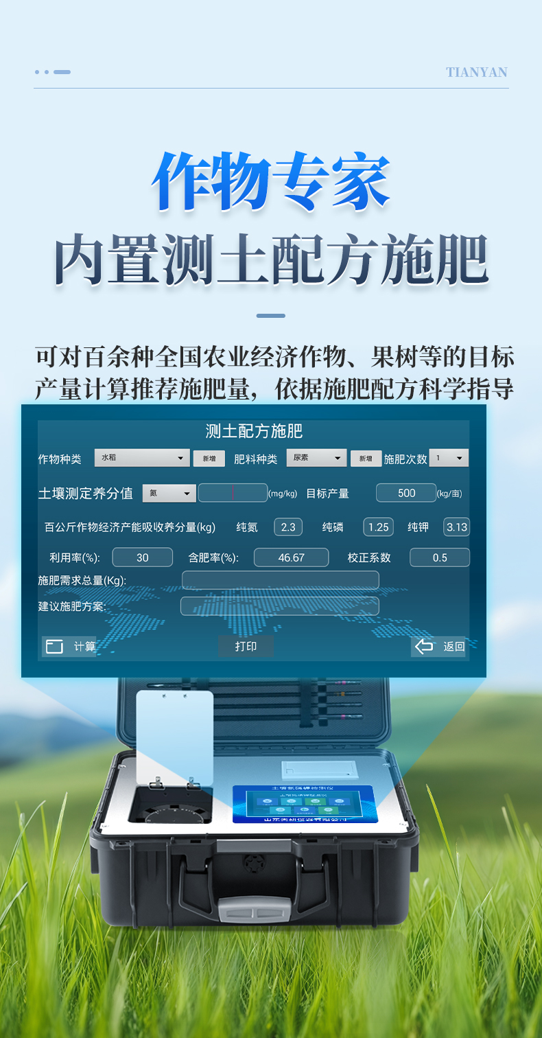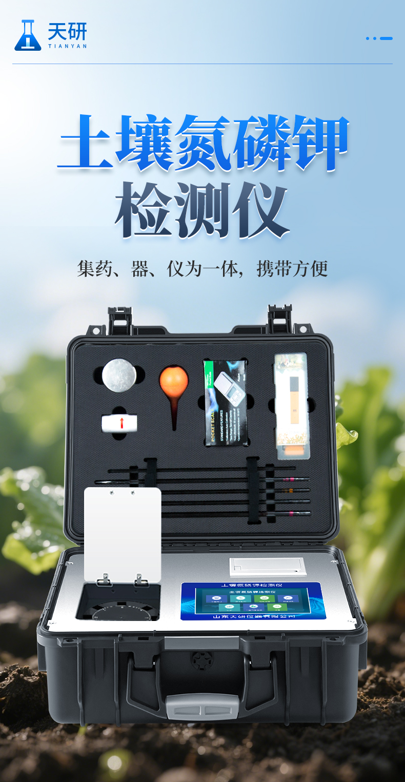 土壤氮磷鉀檢測儀器集藥、器、儀為一體,攜帶方便,相當于一個小型移動實驗室,無需用戶自配附件,亦可靈活野外流動測試。適于農(nóng)業(yè)服務部門或農(nóng)資經(jīng)銷商、合作社、肥料廠商、大種植戶測土施肥和鑒別肥料真假。 檢測功能全:測試項目國內(nèi)外全面,除標配試劑外,其他各類藥劑均可加配選購。