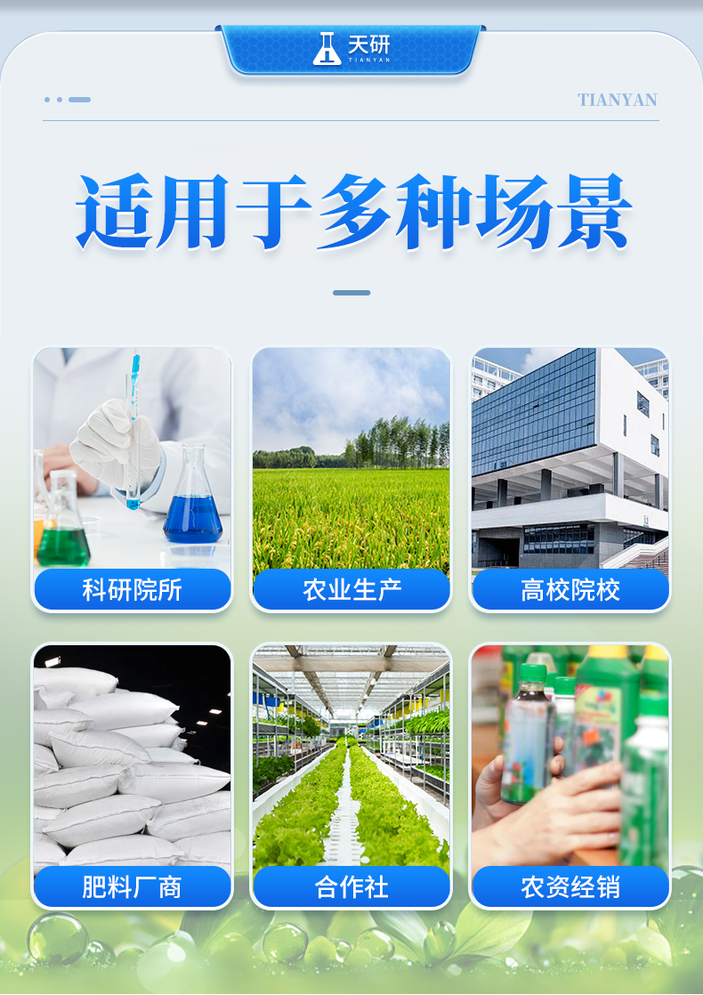 1、土壤養(yǎng)分:●土壤銨態(tài)氮、土壤有效磷、土壤速效鉀、土壤硝態(tài)氮、土壤水解氮、土壤全氮、土壤全磷、土壤全鉀、土壤有機質(zhì)(丘林法)、土壤有機質(zhì)(浸提法)、土壤總有機碳、土壤碳氮比、PH值、含鹽量、水分。 ●土壤中微量元素:土壤鈣、土壤鎂、土壤硫、土壤硅、土壤硼、土壤鐵、土壤銅、土壤錳、土壤鋅、土壤氯、土壤鉬; ●土壤重金屬:土壤鉛、土壤砷、土壤鎘、土壤鉻、土壤汞、土壤鎳、土壤鋁、土壤氟、土壤鈦、土壤硒。 | 2、肥料養(yǎng)分:●單質(zhì)肥:氮肥中銨態(tài)氮、肥料硝態(tài)氮、尿素氮、縮二脲、磷肥中磷、磷肥中水溶性磷、鉀肥中鉀; ●復合肥全氮、復合肥全磷、復合肥全鉀; ●有機肥全氮、有機肥全磷、有機肥全鉀、有機肥硝態(tài)氮、有機肥速效磷、有機肥速效鉀、有機肥酸解氮、有機質(zhì); ●水溶性腐植酸(風化煤)、水溶性腐植酸(褐煤)、水溶性腐植酸(泥炭)、游離態(tài)腐植酸(風化煤)、游離態(tài)腐植酸(褐煤)、游離態(tài)腐植酸(泥炭); ●水溶肥全氮、水溶肥全磷、水溶肥全鉀; ●葉面肥全氮、葉面肥全磷、葉面肥全鉀; ●各種肥料微量元素:肥料鈣、肥料鎂、肥料硫、肥料硅、肥料硼、肥料鐵、肥料銅、肥料錳、肥料鋅、肥料氯、肥料鉬; ●肥料重金屬:肥料鉛、肥料砷、肥料鎘、肥料鉻、肥料汞、肥料鎳、肥料鋁、肥料氟、肥料鈦、肥料硒。 | 3、鮮作物營養(yǎng):●作物硝態(tài)氮、作物銨態(tài)氮、作物磷、作物鉀; ●作物中微量元素:作物鈣、作物鎂、作物硫、作物硅、作物硼、作物鐵、作物銅、作物錳、作物鋅、作物氯、作物鉬; ●作物中硝酸鹽、亞硝酸鹽。 | 4、干植株營養(yǎng):●植株全氮、植株全磷、植株全鉀 | 5、煙葉營養(yǎng):●全氮、全磷、全鉀、還原糖、水溶性總糖、硼、錳、鐵、銅、鈣、鎂等20項。 | 6、食品(水果、蔬菜等):●硝酸鹽、亞硝酸鹽、重金屬(鉛、鉻、鎘、砷、汞)等項。 | 7、水質(zhì)中:●銨態(tài)氮、水中磷、水中鉀、硝酸鹽、亞硝酸鹽、硬度、PH、鐵、銅、錳、鋅、硼、氯、硫、硅、鉬等 |