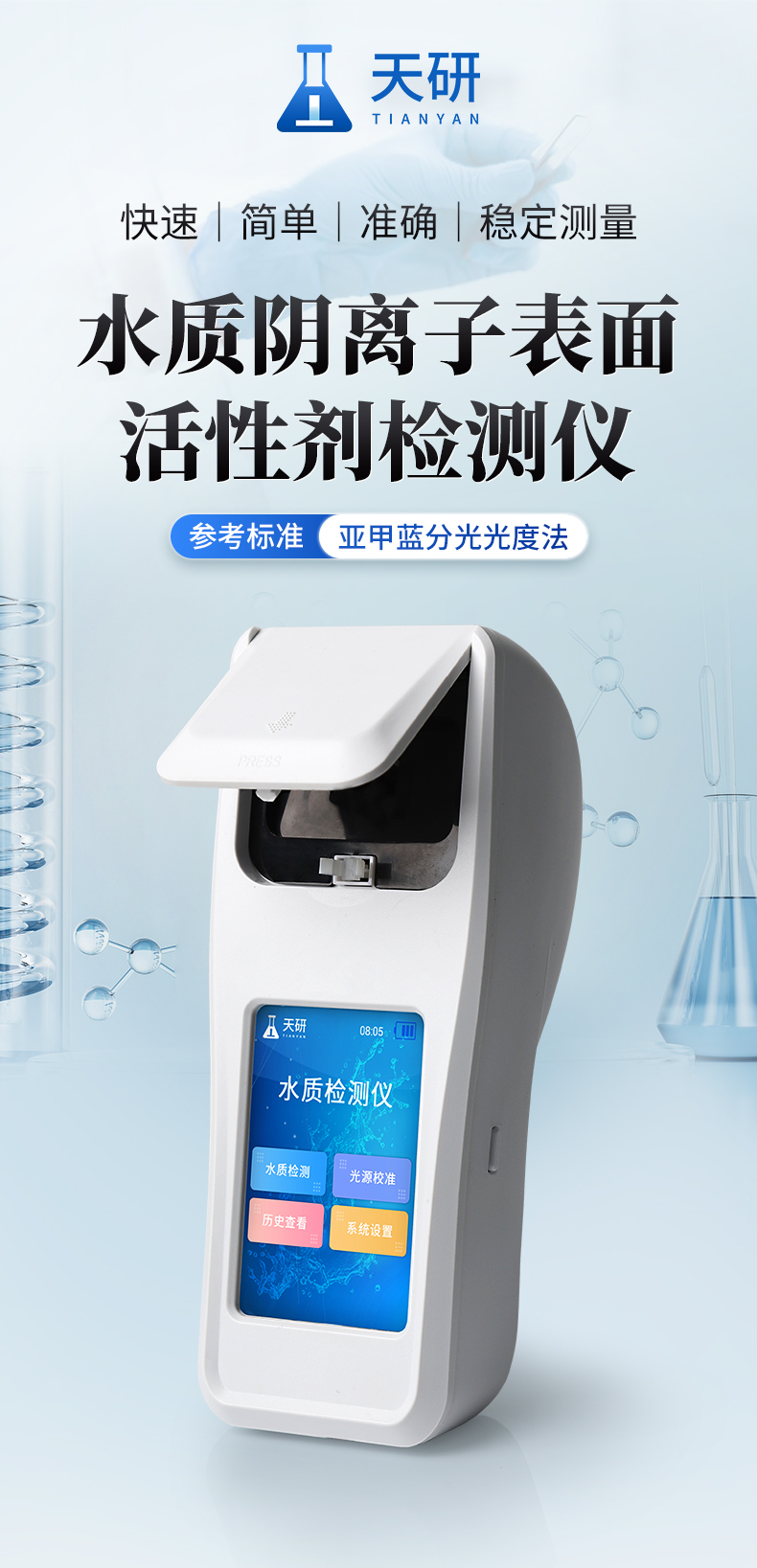 便攜式陰離子表面活性劑檢測儀參考《水質(zhì) 陰離子表面活性劑的測定 亞甲藍分光光度法》方法設計制造,本儀器采用高精度長壽命冷光源,可“快速、簡單、準確、穩(wěn)定”進行測量,儀器廣泛應用于飲用水、地表水、生活污水水、廢水等的水質(zhì)陰離子表面活性劑含量的測定。