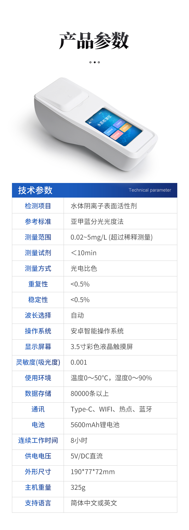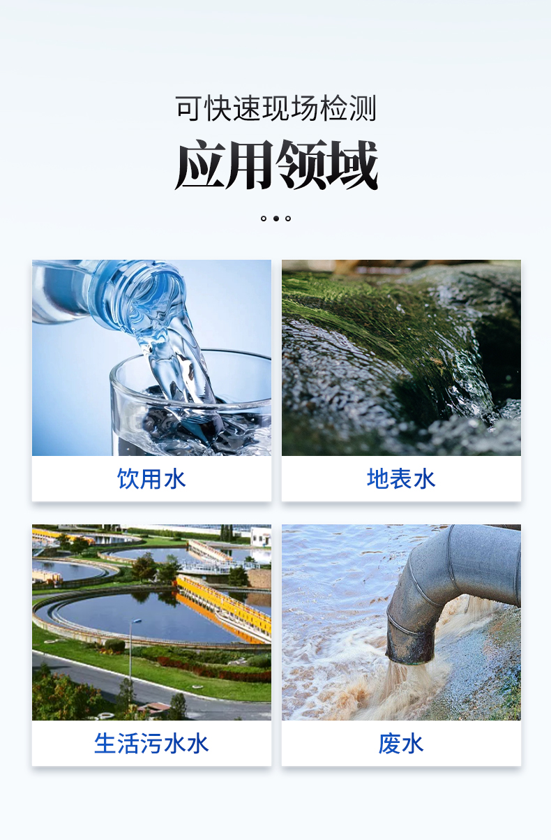 | 檢測項目:水體陰離子表面活性劑; | 參考標準:亞甲藍分光光度法; | 測量范圍:0.02~5mg/L (超過稀釋測量); | 測量時間:<10min; | 測量方式:光電比色; | 重復性:<0.5%; |