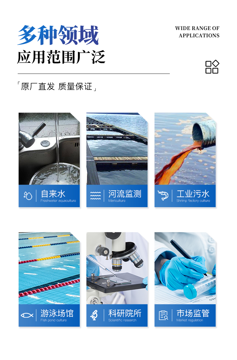 適用于 游泳場館、飲用水、自來水、醫(yī)療廢水、工業(yè)污、河流監(jiān)測、水源保護(hù)、生產(chǎn)監(jiān)測、科研實(shí)驗(yàn)等。