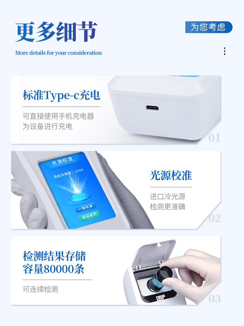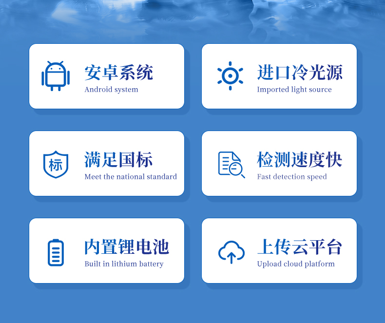 | 1、安卓智能系統(tǒng),操作更佳簡便快捷; | 2、配置云監(jiān)控平臺,檢測結(jié)果可直接無線傳至平臺,進(jìn)行水質(zhì)長短期分析,輔助管理。 | 3、內(nèi)置操作流程、操作簡單、無需培訓(xùn)、直接上手; | 4、檢測速度更快,現(xiàn)場讀取數(shù)據(jù); | 5、便攜式體積小,重量輕,方便戶外檢測; | 6、外形小巧美觀,工作穩(wěn)定免維護(hù),具有較好的性價比; | 7、采用進(jìn)口冷光源,光學(xué)性能穩(wěn)定,壽命長達(dá)10萬小時; | 8、交直流兩用,內(nèi)置充電鋰電池,環(huán)保耐用可支持連續(xù)室內(nèi)外工作。 |
