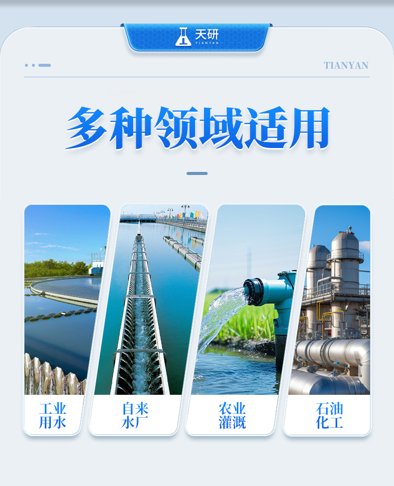 可以廣泛應(yīng)用于鍋爐水、工業(yè)用水、自來(lái)水廠、生活飲用水、石油化工、農(nóng)業(yè)灌溉、飲料食品制造業(yè)等行業(yè)。