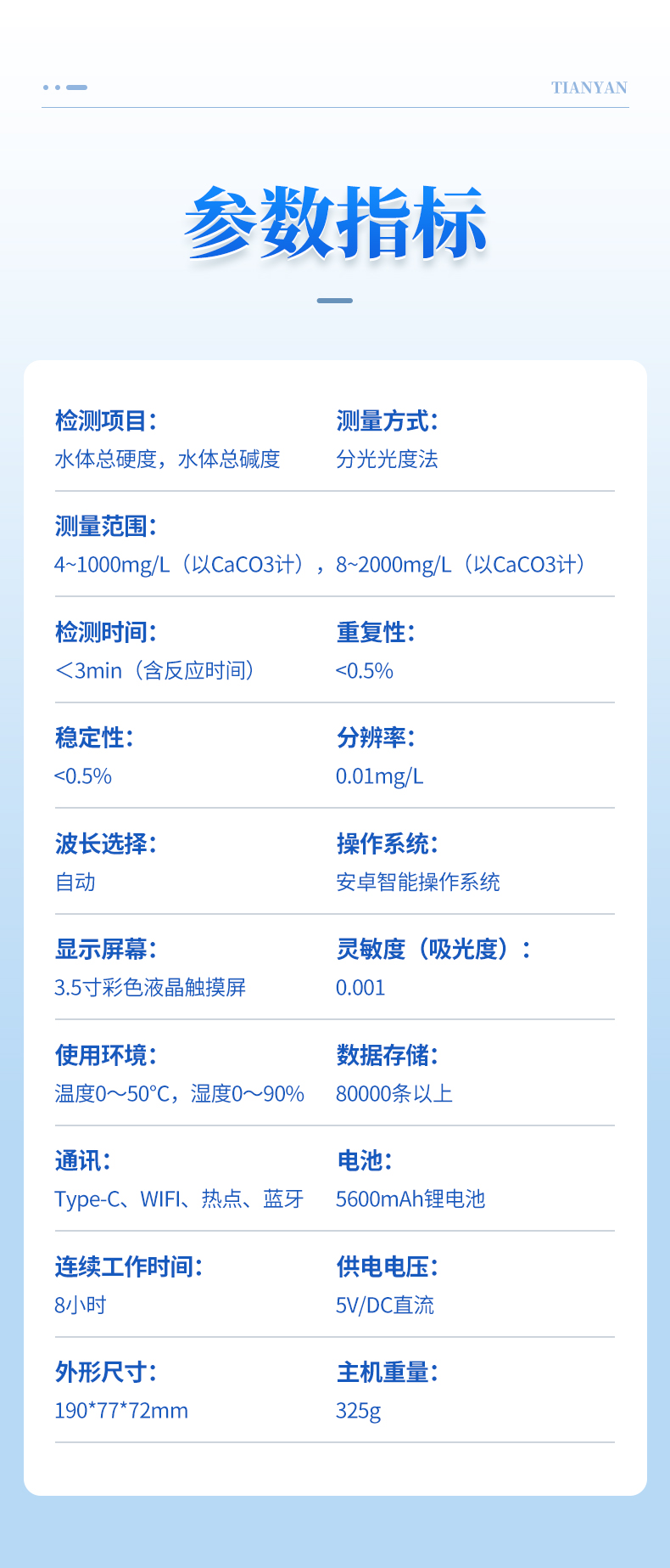 | 檢測(cè)項(xiàng)目:水體總硬度,水體總堿度; | 測(cè)量范圍:4~1000mg/L(以CaCO3計(jì)),8~2000mg/L(以CaCO3計(jì)); | 測(cè)量方式:分光光度法; | 檢測(cè)時(shí)間:<3min(含反應(yīng)時(shí)間); | 重復(fù)性:<0.5%; | 穩(wěn)定性:<0.5%; |
