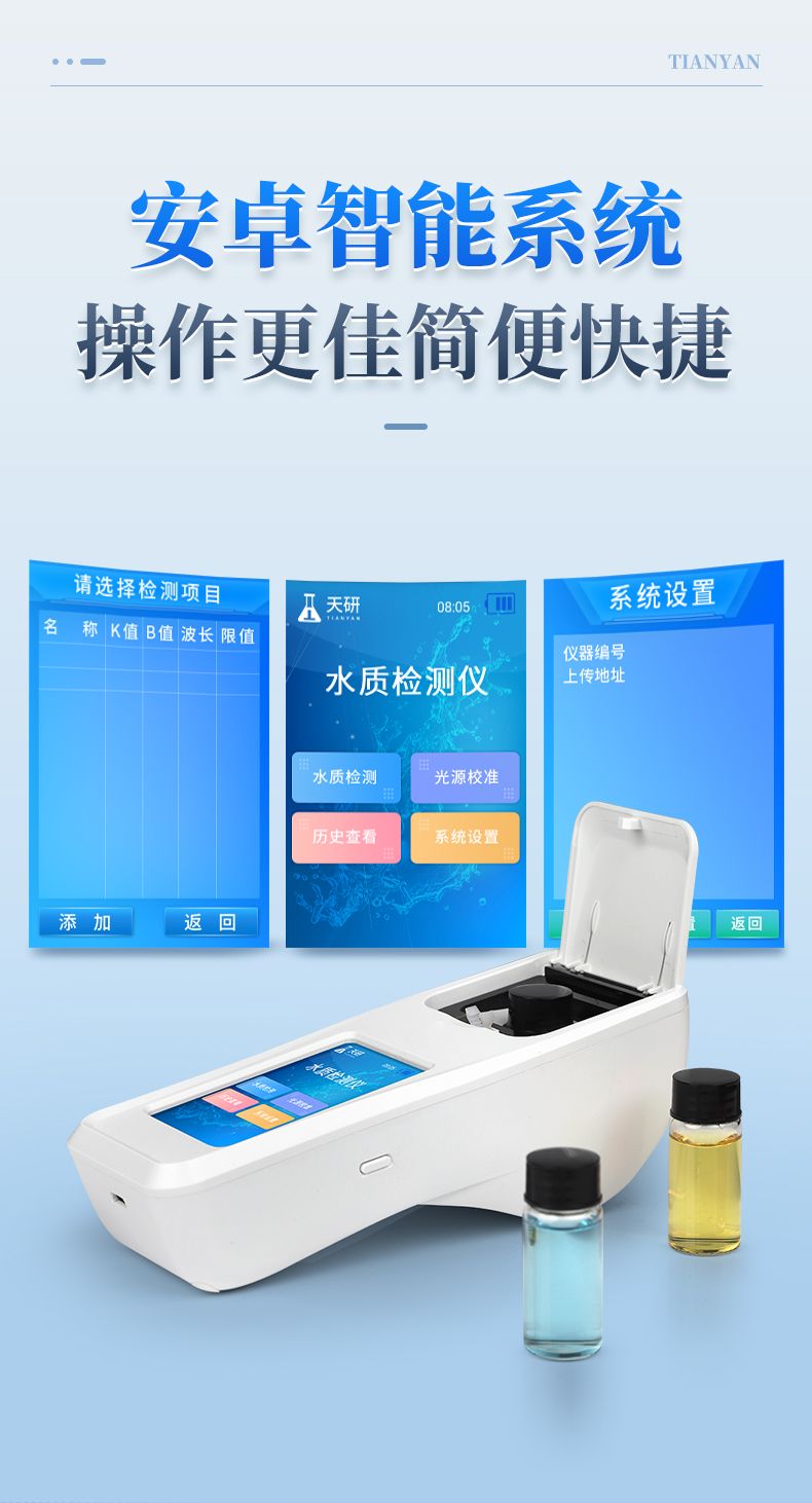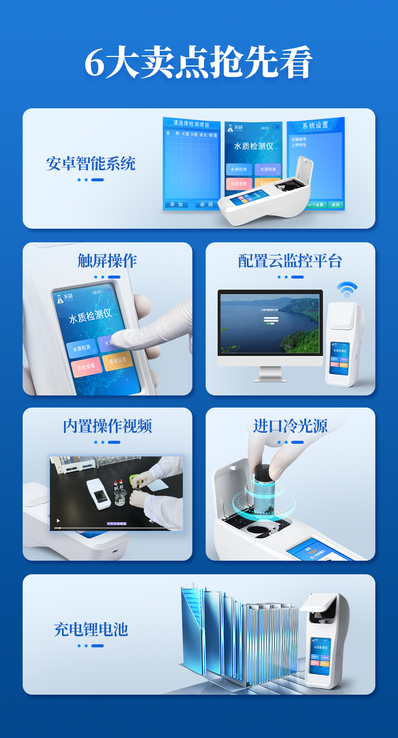 | 1、安卓智能系統(tǒng),操作更佳簡(jiǎn)便快捷; | 2、配置云監(jiān)控平臺(tái),檢測(cè)結(jié)果可直接無(wú)線傳至平臺(tái),進(jìn)行水質(zhì)長(zhǎng)短期分析,輔助管理; | 3、內(nèi)置操作流程、操作簡(jiǎn)單、無(wú)需培訓(xùn)、直接上手; | 4、檢測(cè)速度更快,現(xiàn)場(chǎng)讀取數(shù)據(jù); | 5、便攜式體積小,重量輕,方便戶(hù)外檢測(cè); | 6、外形小巧美觀,工作穩(wěn)定免維護(hù),具有較好的性?xún)r(jià)比; | 7、采用進(jìn)口冷光源,光學(xué)性能穩(wěn)定,壽命長(zhǎng)達(dá)10萬(wàn)小時(shí); | 8、交直流兩用,內(nèi)置充電鋰電池,環(huán)保耐用可支持連續(xù)室內(nèi)外工作。 |