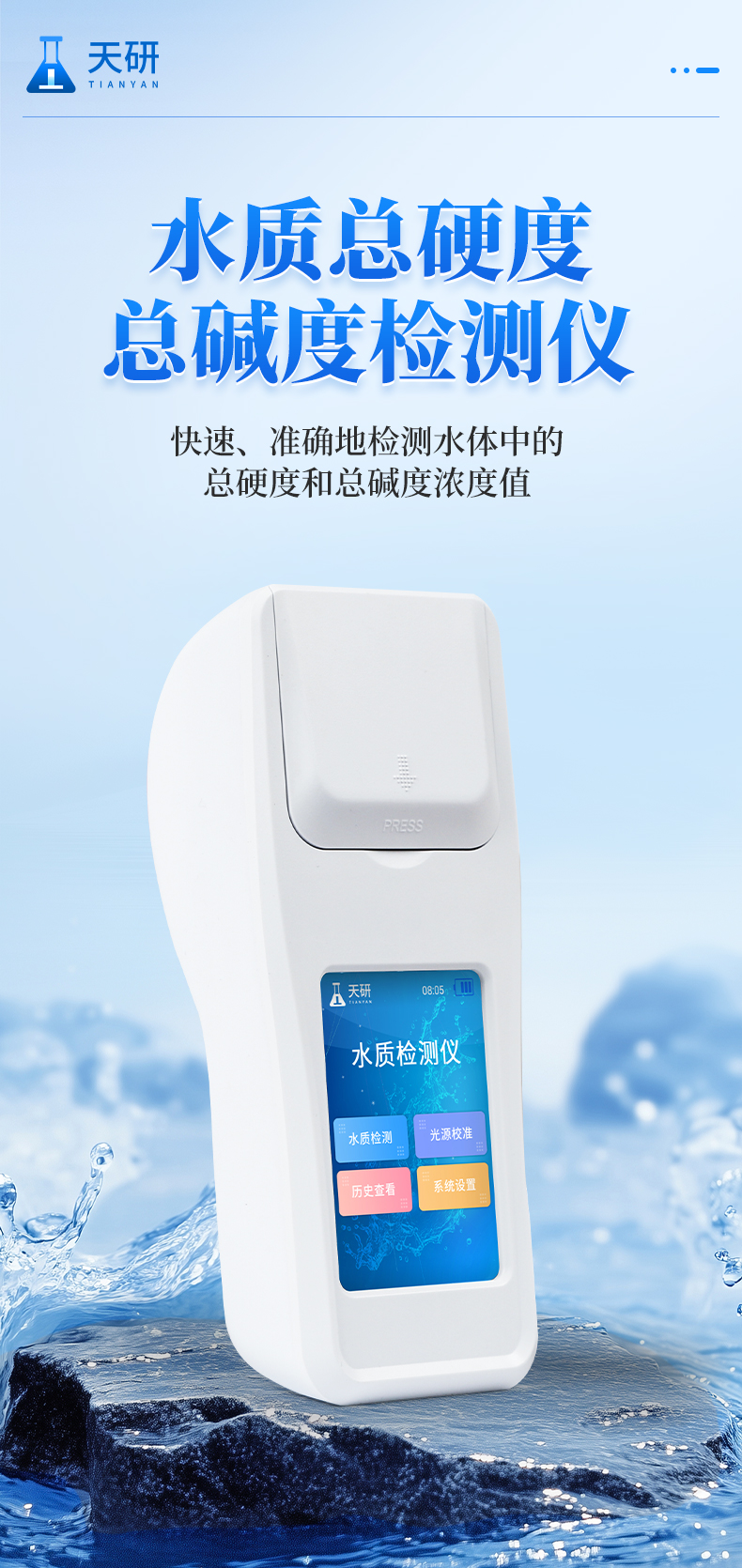 水質(zhì)總硬度總堿度檢測(cè)儀可簡(jiǎn)單快速測(cè)試水質(zhì)中總硬度、總堿度濃度值。利用比色法原理配合總硬度、總堿度檢測(cè)試劑快速準(zhǔn)確測(cè)試水中總硬度總堿度含量。