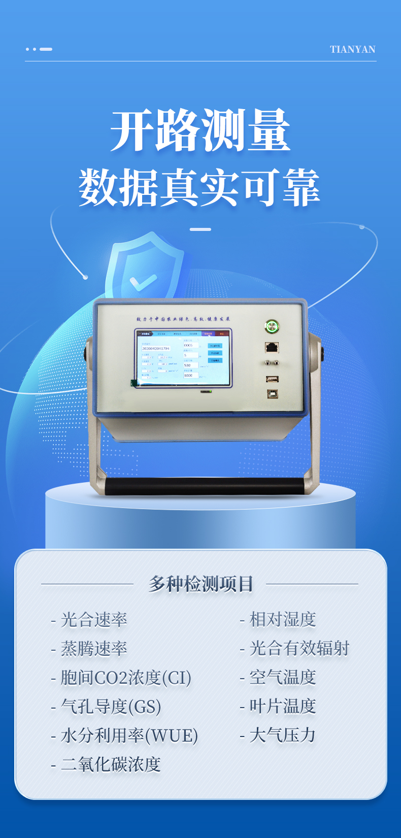 葉片光合速率 (Pn) 葉片蒸騰速率 (Tr) 氣孔導(dǎo)度(Gs) 細(xì)胞間CO2濃度(Ci) 水分利用率(WUE) 可增加呼吸速率測(cè)量(Rd)
