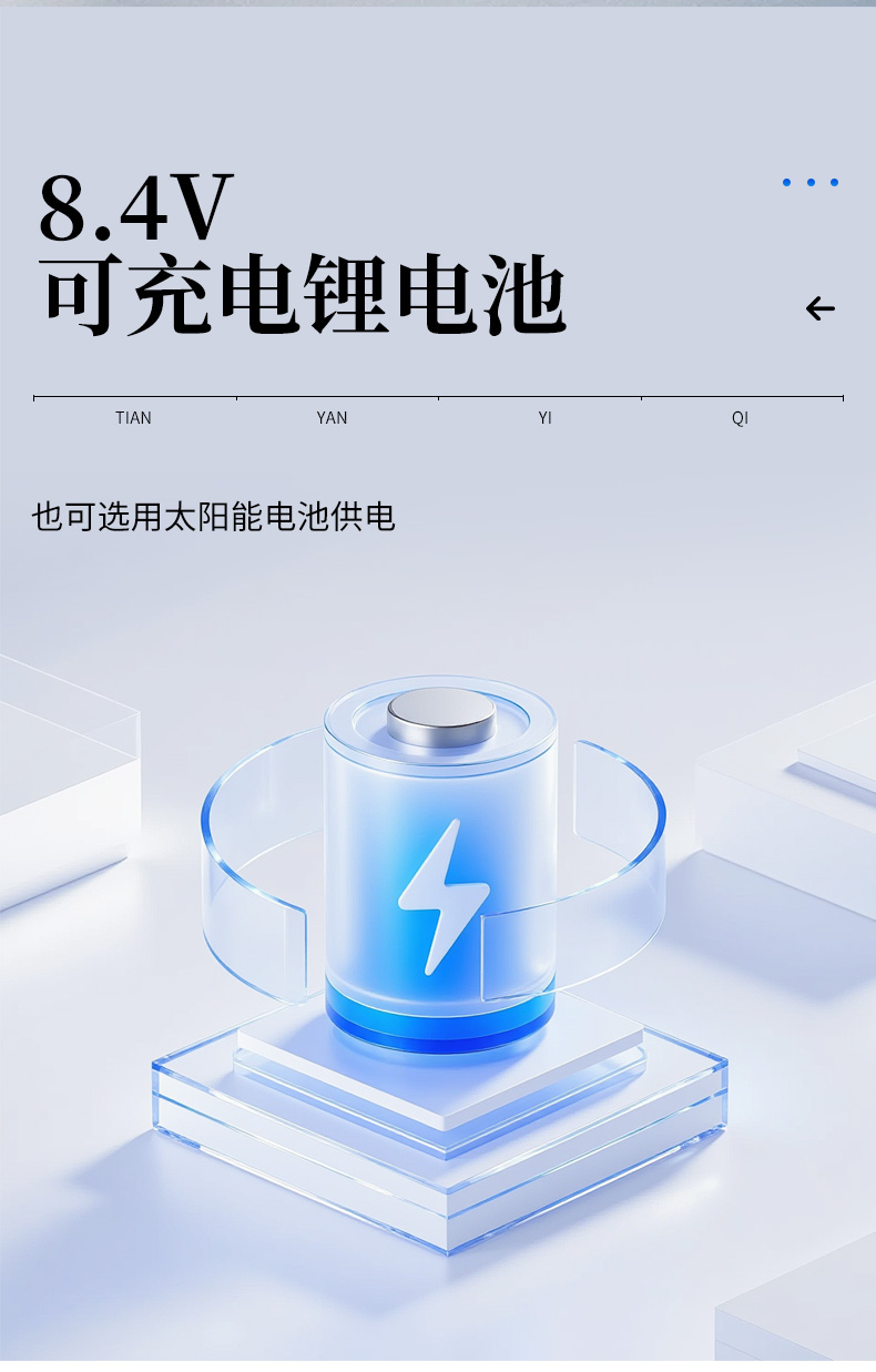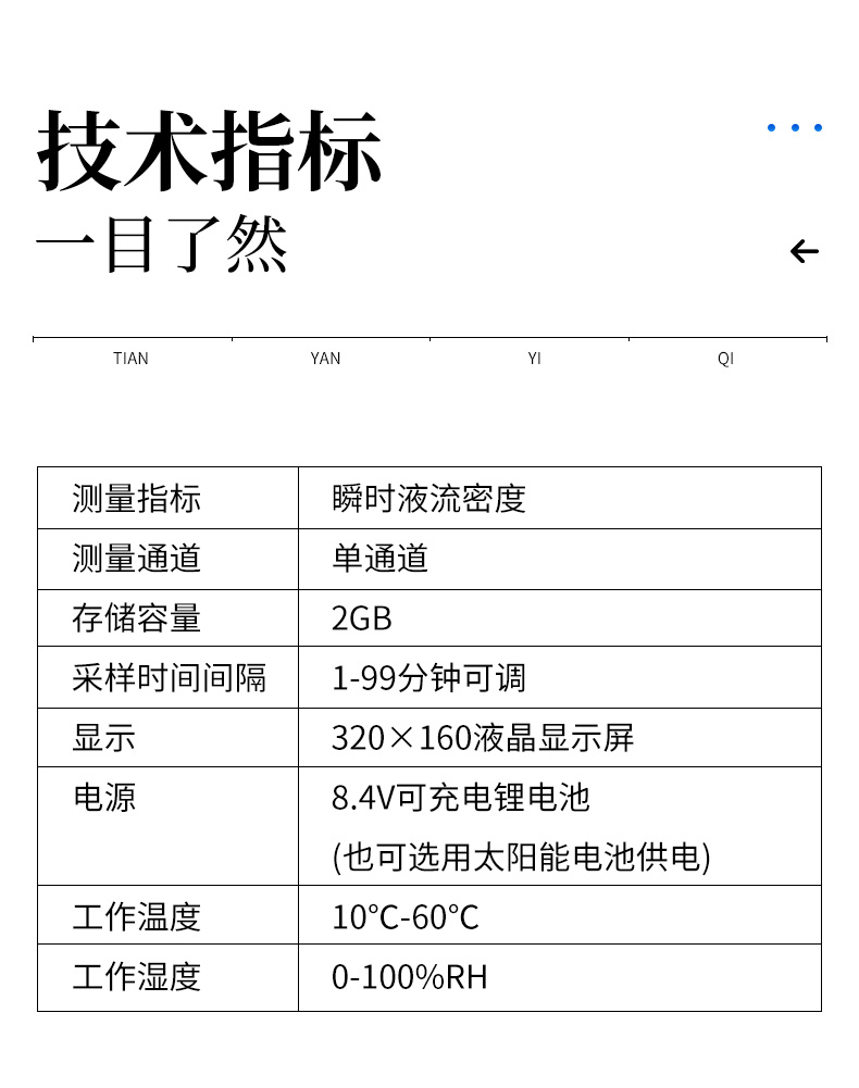 | 顯示:320×160液晶顯示屏 | 電源:8.4V可充電鋰電池(也可選用太陽(yáng)能電池供電) |