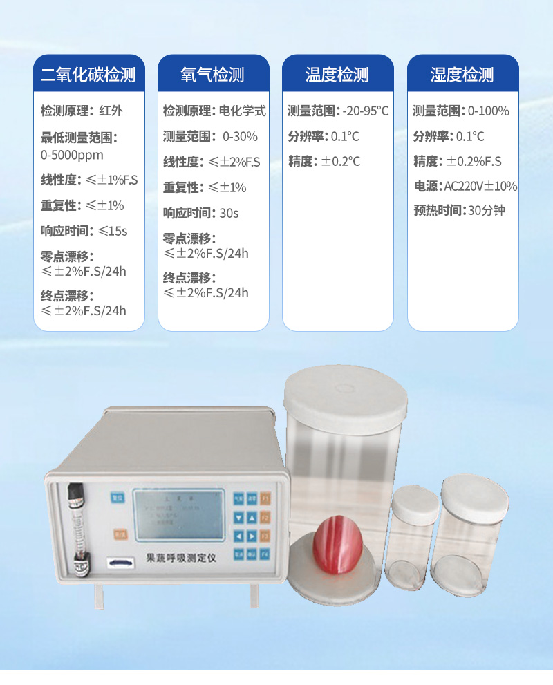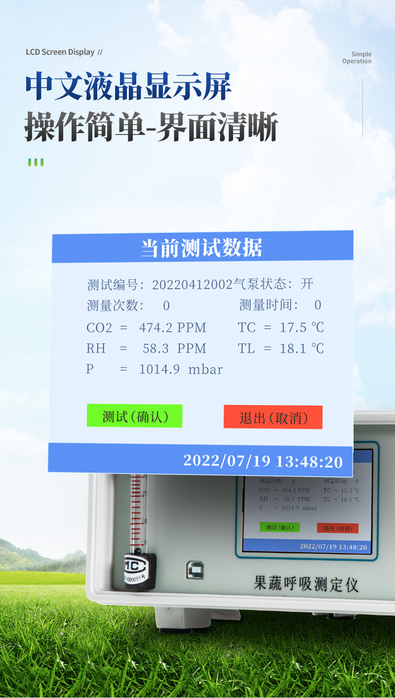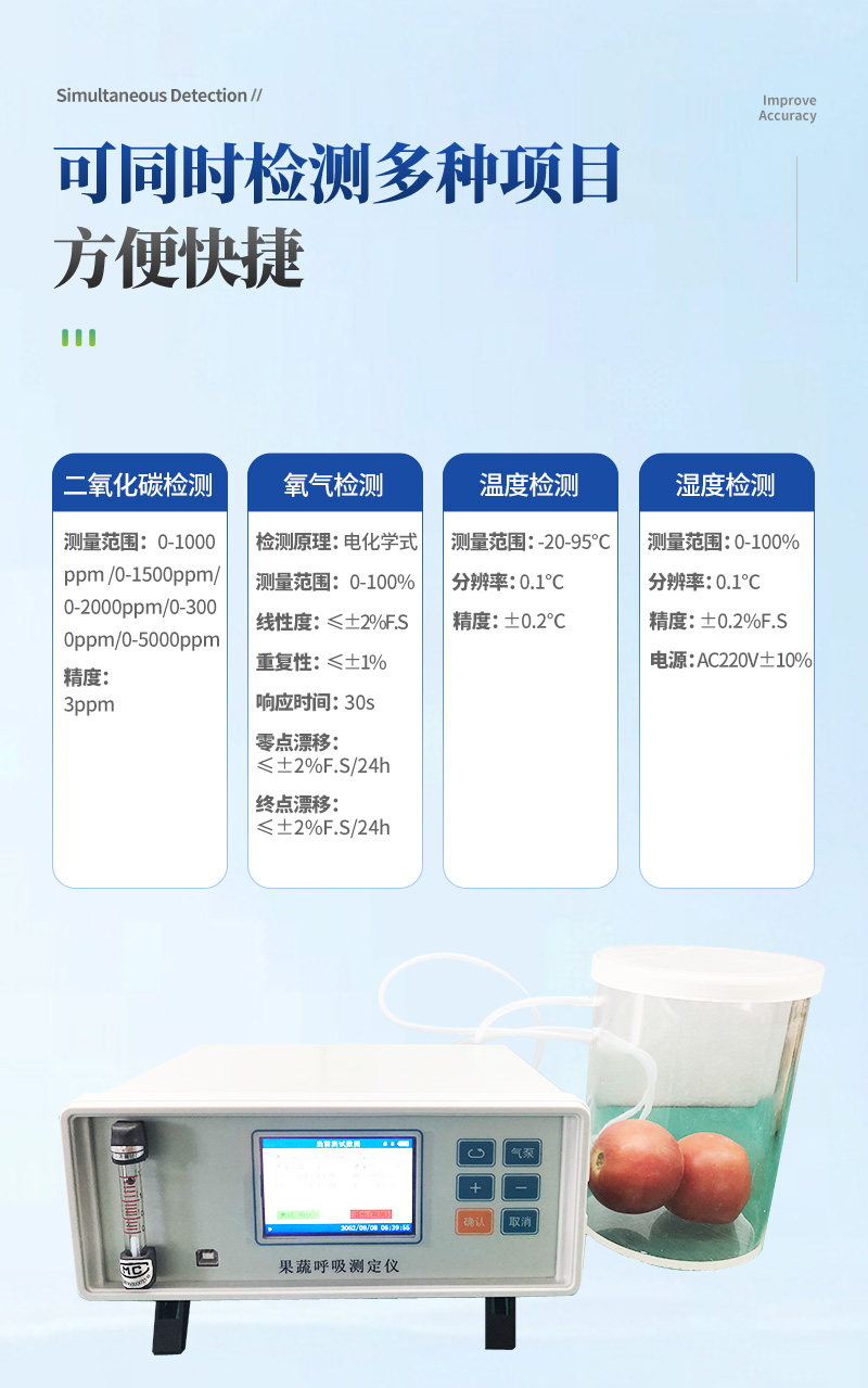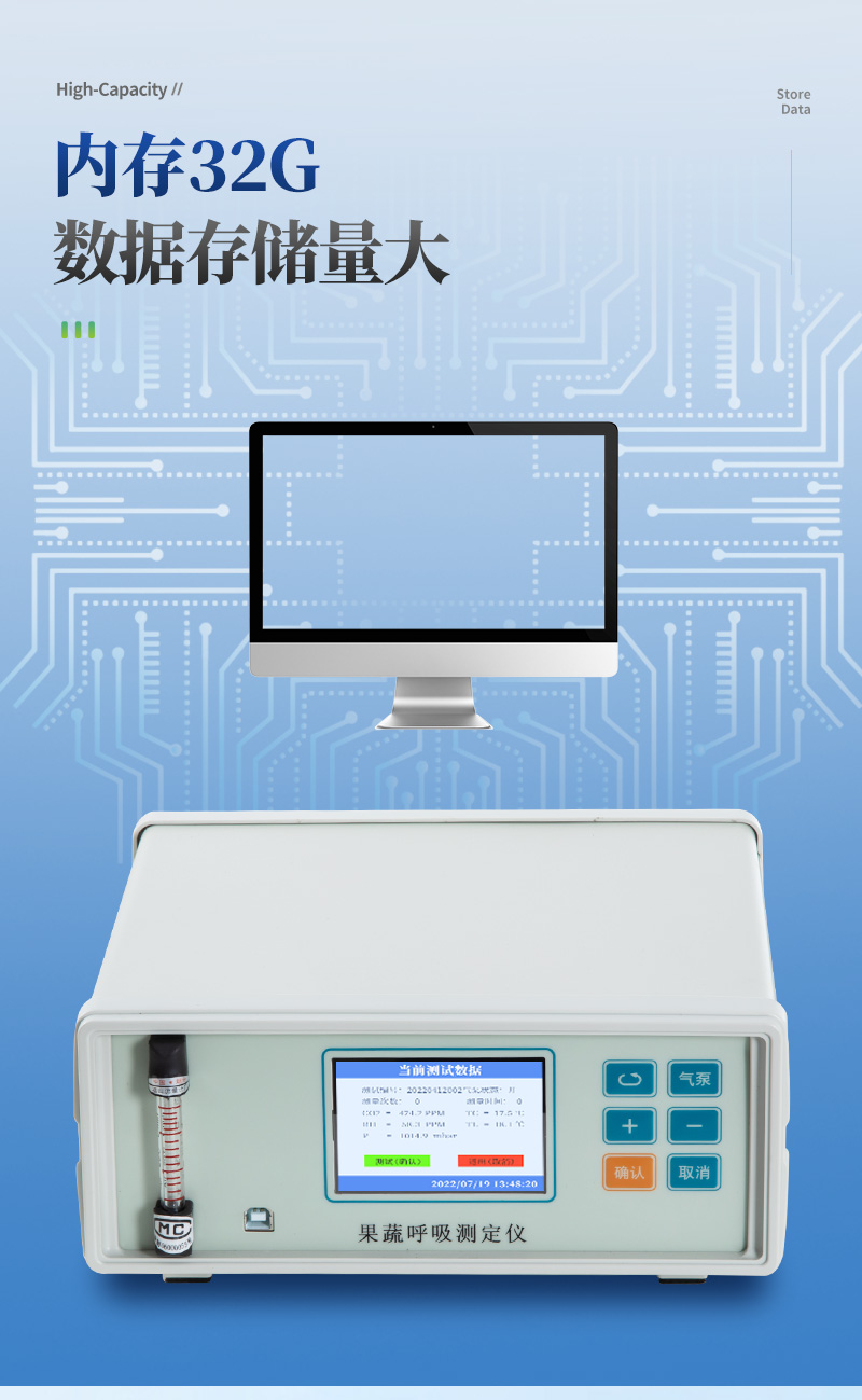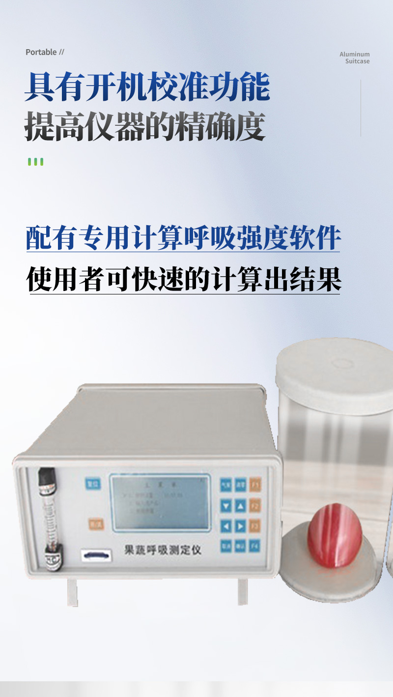 果蔬呼吸測定儀專門用于常溫、冷藏庫、氣調(diào)庫、超市冷柜等儲藏條件下的果品和蔬菜呼吸強度的測定和分析研究。該儀器的特點是可以根據(jù)果蔬的大小來選擇不同體積的呼吸室,加快了平衡和測定時間;可以同時顯示呼吸室的CO2濃度、O2濃度、溫度和濕度。該儀器具有多功能、高精度、快速、**、方便等特