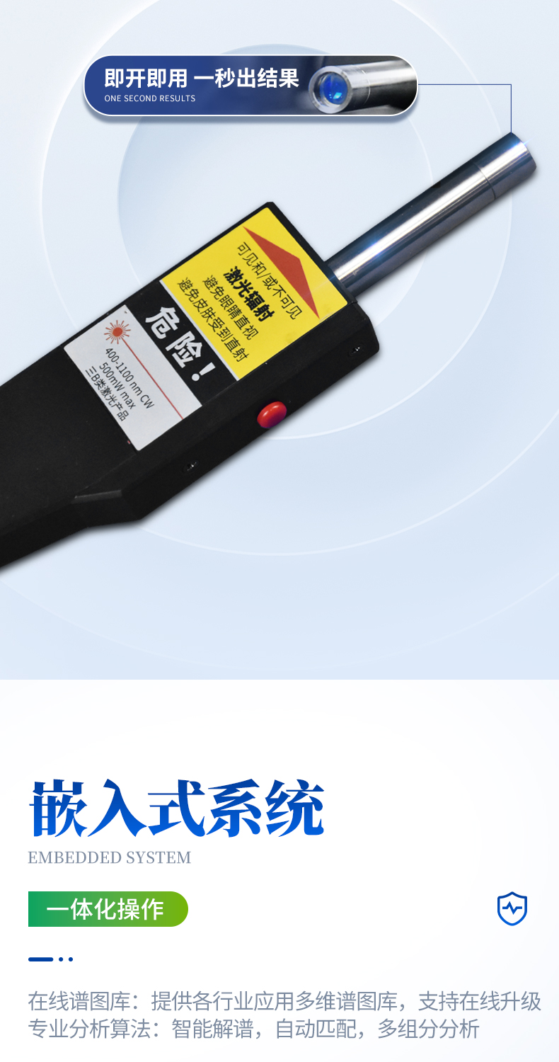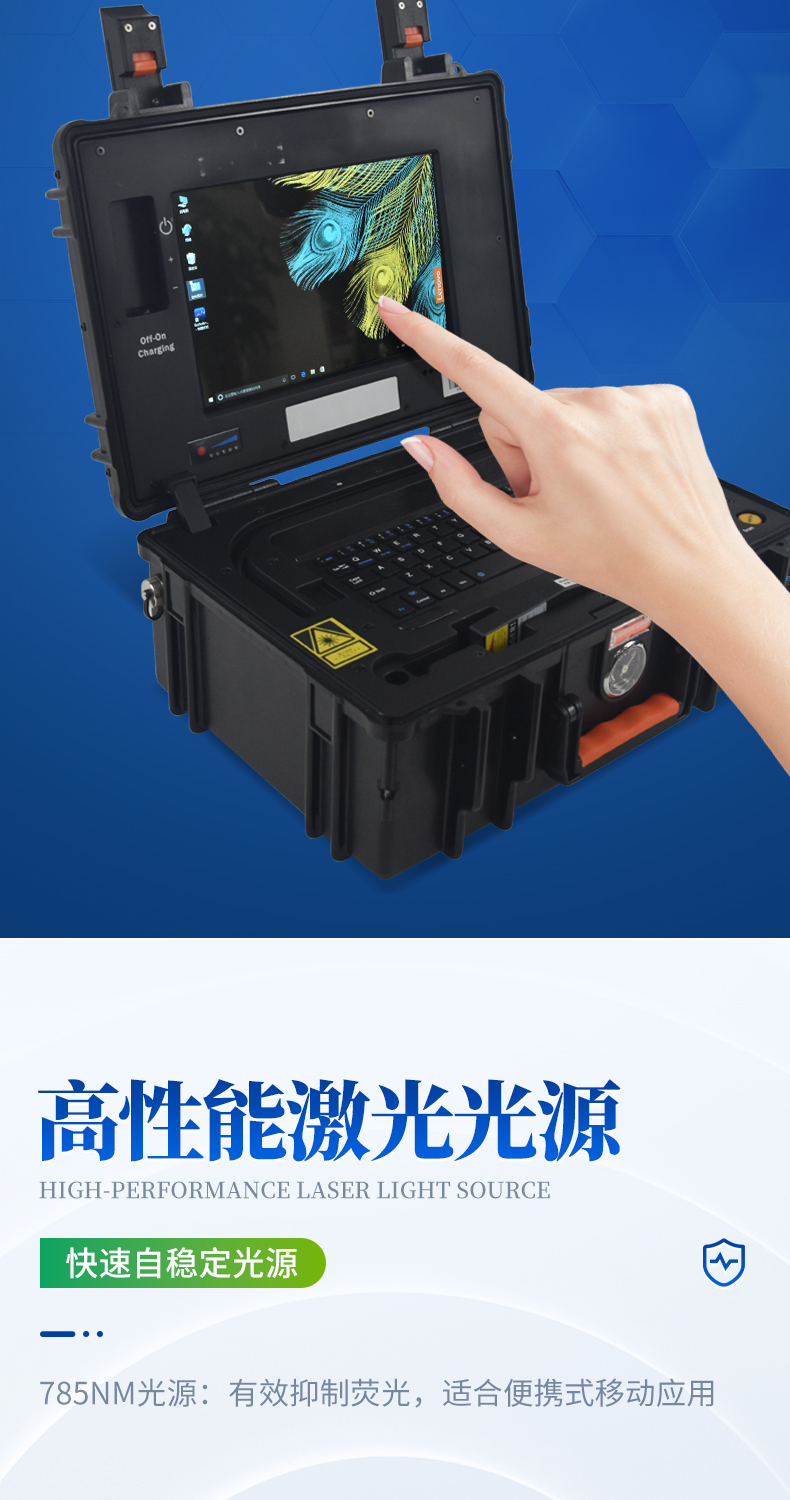 詳細(xì)產(chǎn)品介紹及技術(shù)參數(shù) 該儀器是一款易于攜帶的便攜式拉曼光譜儀。它通過(guò)激光照射樣品表面,與樣品交互作用后,收集散射的光,并分析光散射光譜中的拉曼散射光。這些拉曼散射光包含了物質(zhì)分子的振動(dòng)和轉(zhuǎn)動(dòng)信息,從而提供了關(guān)于樣品化學(xué)成分和分子結(jié)構(gòu)的信息,進(jìn)而進(jìn)行化學(xué)分析和物質(zhì)鑒定。 產(chǎn)品